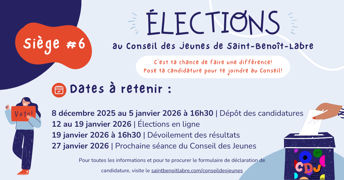 Si tu souhaites te présenter comme candidate ou candidat aux élections du Conseil des Jeunes et que tu réponds aux conditions d’éligibilité, tu dois remettre un formulaire de déclaration de candidature à Valérie, coordonnatrice en loisirs et à la culture, entre le 8 décembre 2025 et le 5 janvier 2026 au plus tard à 16h30.